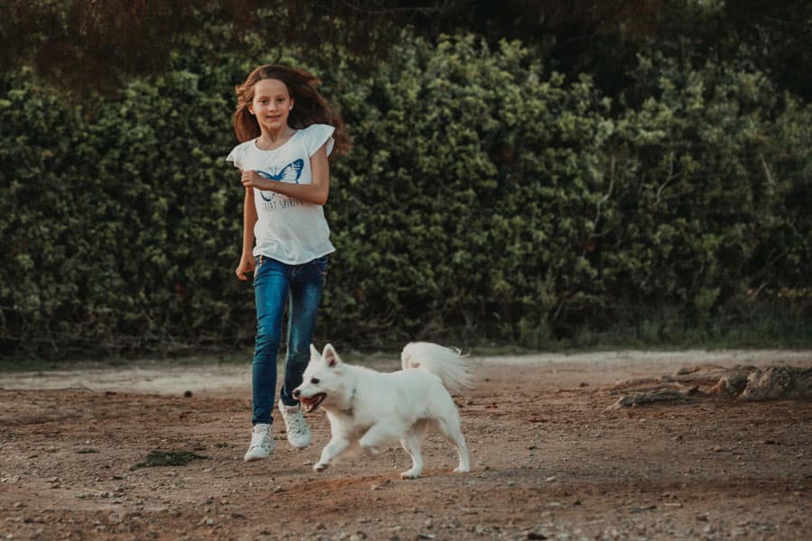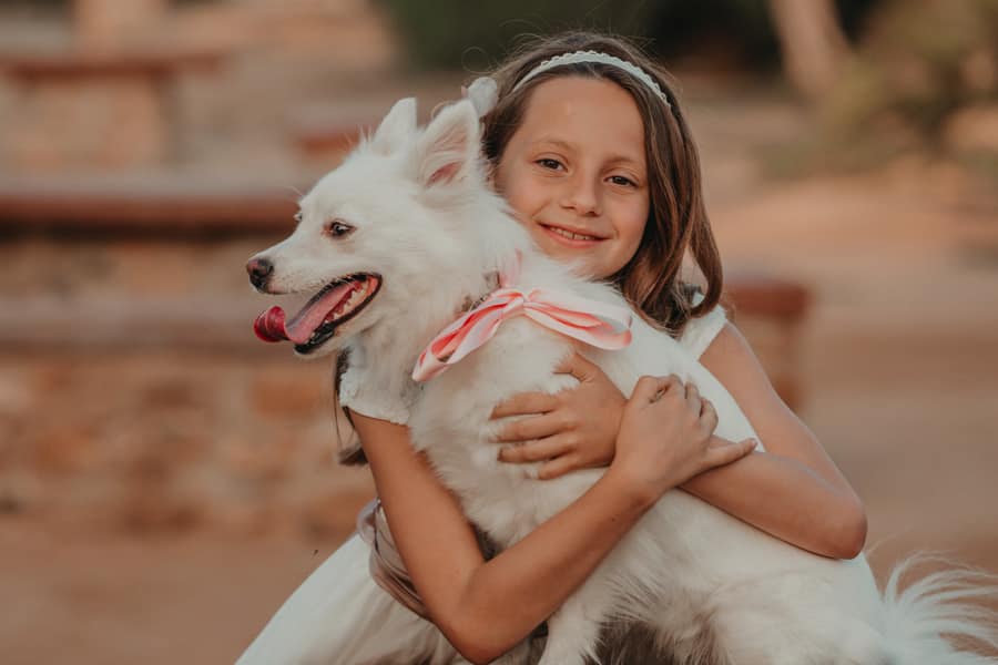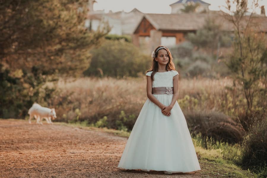 En las fotos vemos a Blanca vestida de comunión y también con su ropa habitual de diario, así se sentirá más cómoda para jugar con su perrito que también ha venido a la sesión de fotos.